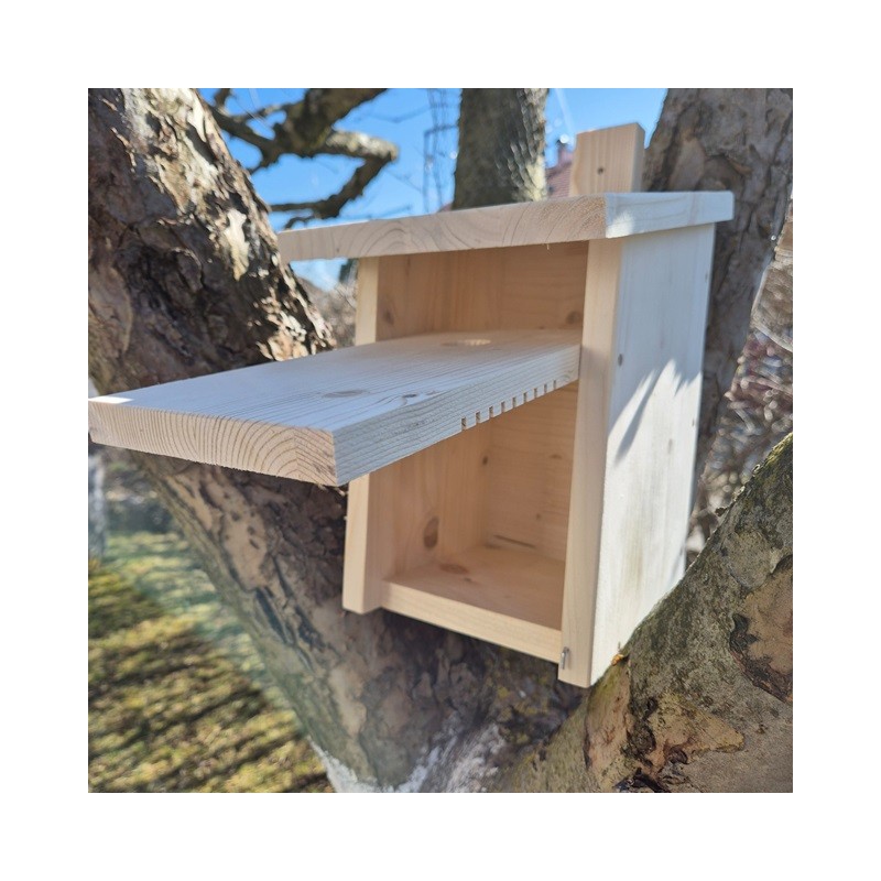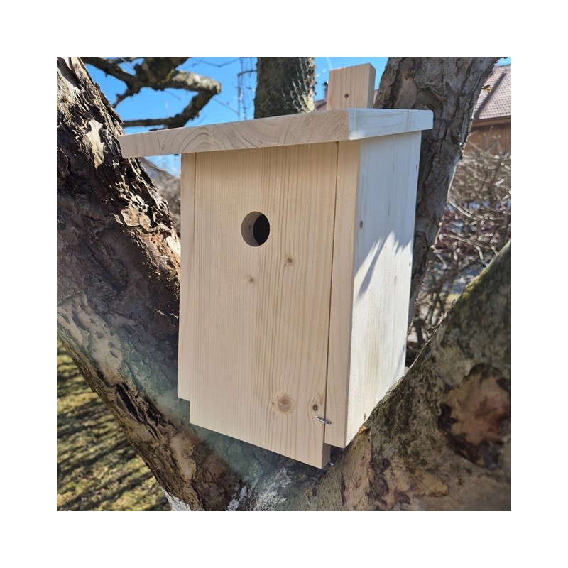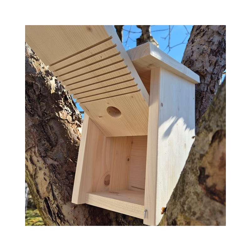 Der Nistkasten ist naturbelassen und wird mit einer Aufhängeleiste, welche vorgebort ist, geliefert.